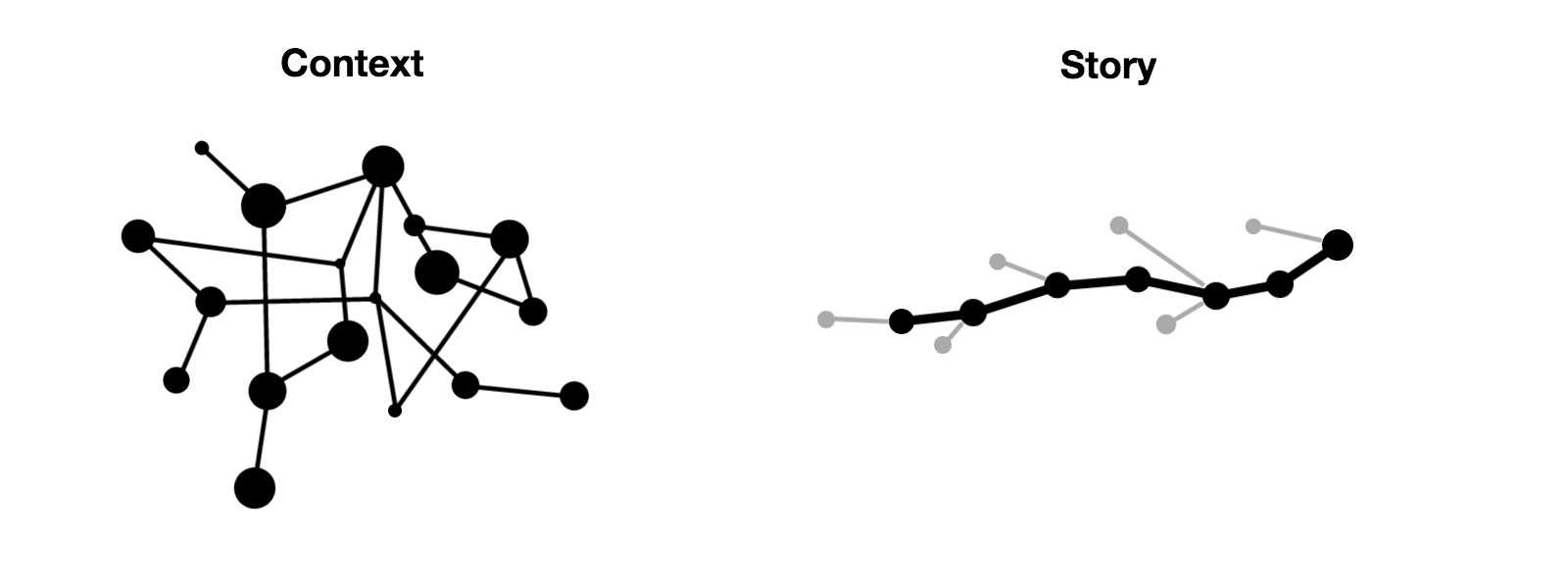 In fictional media like film and theatre stories are used more consistently and consequently than in factual media like scientific journals or, well, data visualisation. But stories are tempting for all communication as they are such an efficient vessel of meaning. Streamlined to the way we make sense of the world, suitably flexible to live in different contexts, dense enough to be stored as a single unit, yet appropriately unspecific to be filled with the audience’s own world knowledge. The presentation layer as well as the techniques to unfold a story might differ from books (thought and action) to films or theatre (visual likeness and similarity), to articles (anecdotes and sidebars) and eventually to data visualisation (graphical primitives and multimedia). But all follow principles of storytelling in some respect in order to unfold a changed perspective.